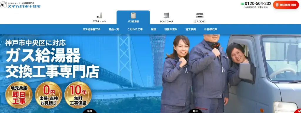 給湯器駆け付け隊は、株式会社ミズテックが運営する給湯器交換業者です。神戸市を担当する大阪営業所は八尾市に所在しており、申し込みから最短30分で修理・交換してもらえます。