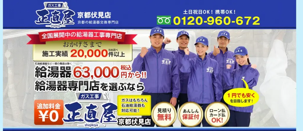 給湯器駆け付け隊は、株式会社ミズテックが運営する給湯器交換業者です。京都市を担当する大阪営業所は八尾市に所在しており、申し込みから最短30分で修理・交換してもらえます。