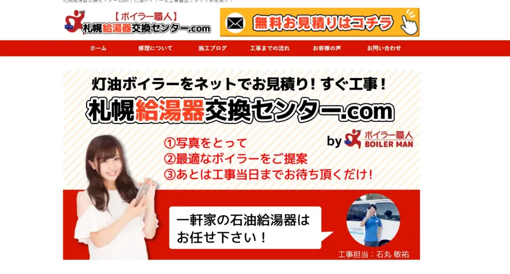 給湯器駆け付け隊は、株式会社ミズテックが運営する給湯器交換業者です。札幌営業所は手稲区に所在しており、申し込みから最短30分で修理・交換してもらえます。