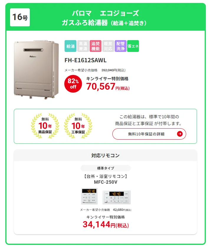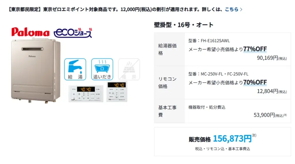 料金 | パロマ16号給湯専用 本体価格:34,276円 台所リモコン価格:7700円 基本工事費(注1):40,700円 販売価格:82,676円 リンナイ 24号ふろ給湯器 本体価格:125,048円 台所・浴室リモコン価格:22,000円 基本工事費(注1):53,900円 販売価格:200,948円 など |
