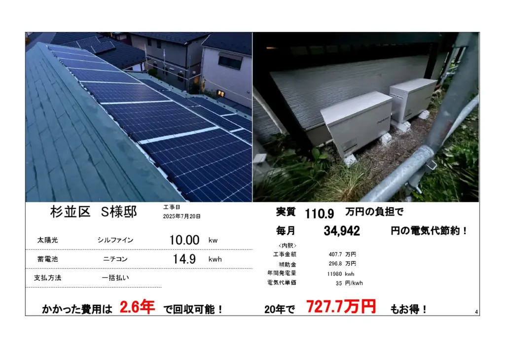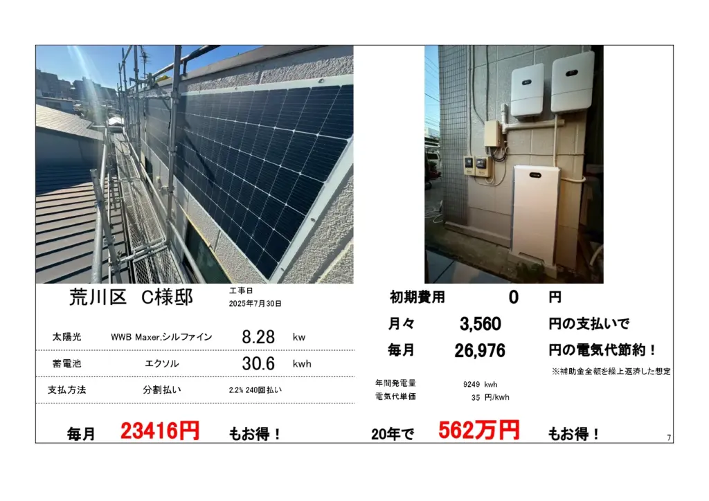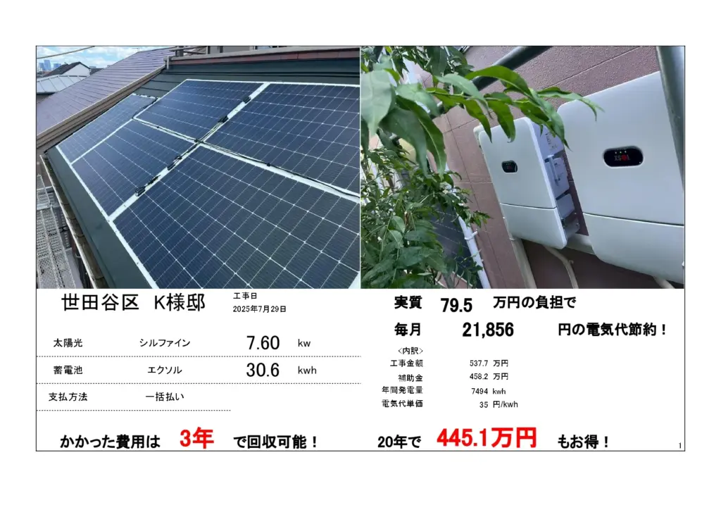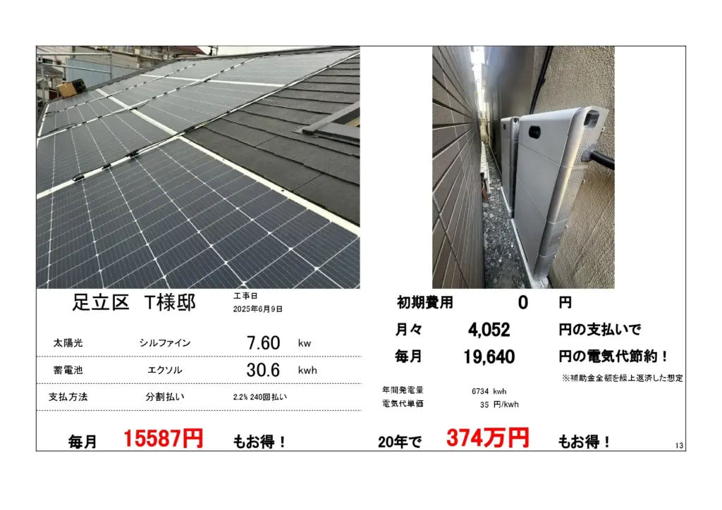 ※基本料金はかかります。太陽光+防水+蓄電池補助金(合計546万)発電量・家の形状によって異なる。500万超え実績あり